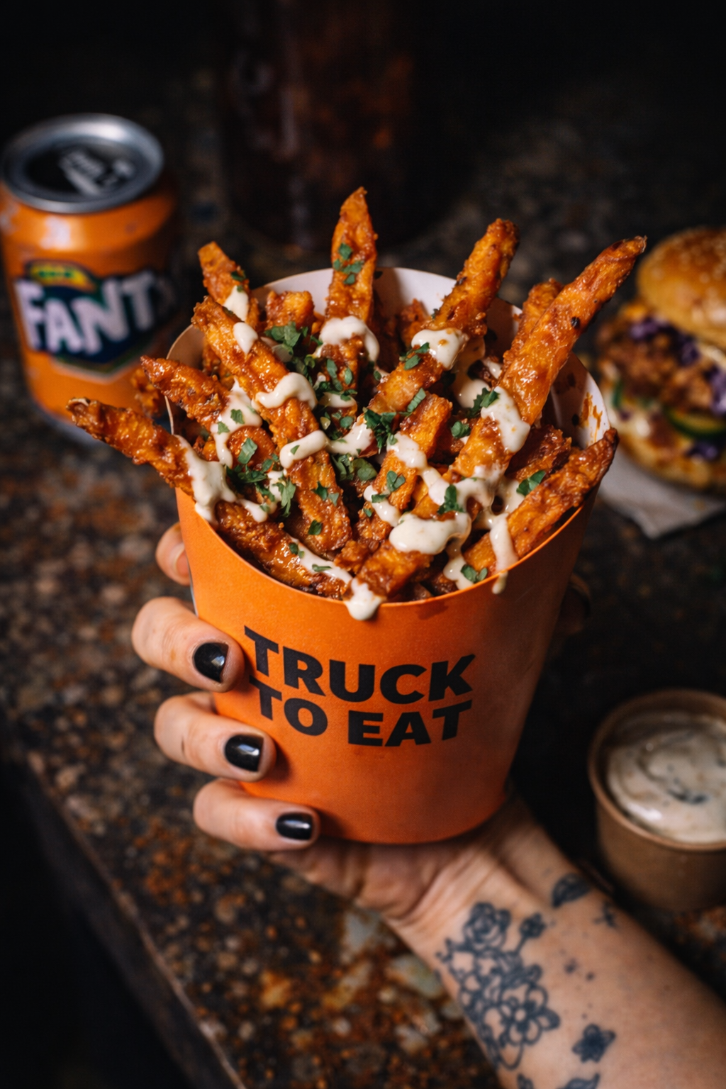 Buttermilk fried chicken or plant-based patty, slaw, pickles, spicy mayo or vegan sauce.