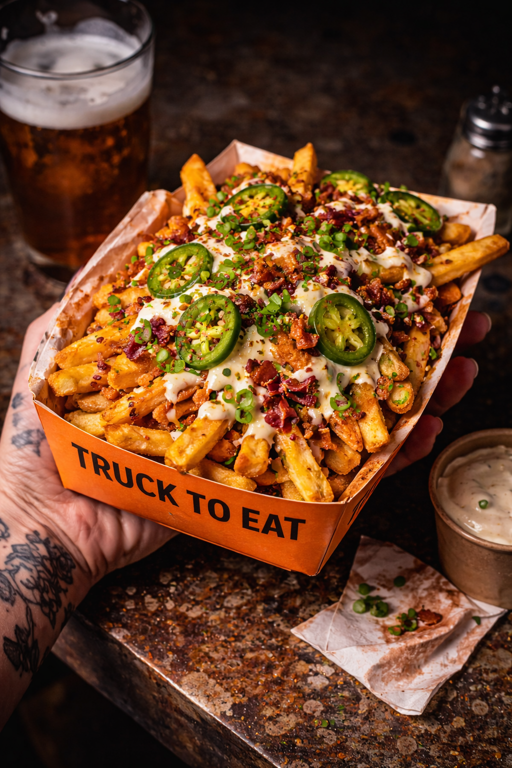 Cheese sauce, bacon or veggie topping, spring onions.